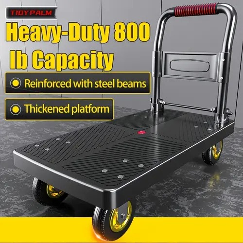 Crafted with a reinforced steel and metal frame, it offers reliable support and long-term durability. The textured anti-slip platform helps prevent cargo from sliding, while the ergonomically designed handle improves control and comfort. Thanks to the quiet, 360° swivel wheels, you’ll enjoy smooth and silent transportation even on rough surfaces — and with lockable front casters, your load stays securely in place when parked.