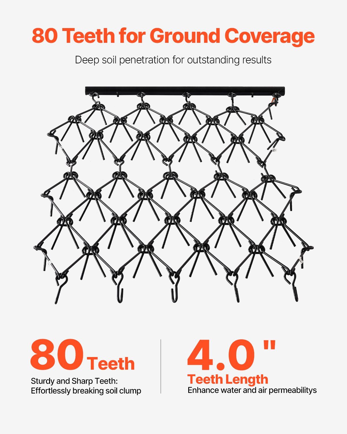 With 80 sturdy teeth, each 5.9 in long, this chain harrow rake penetrates the soil easily, breaking up hard ground and enhancing soil aeration and drainage for improved soil health.