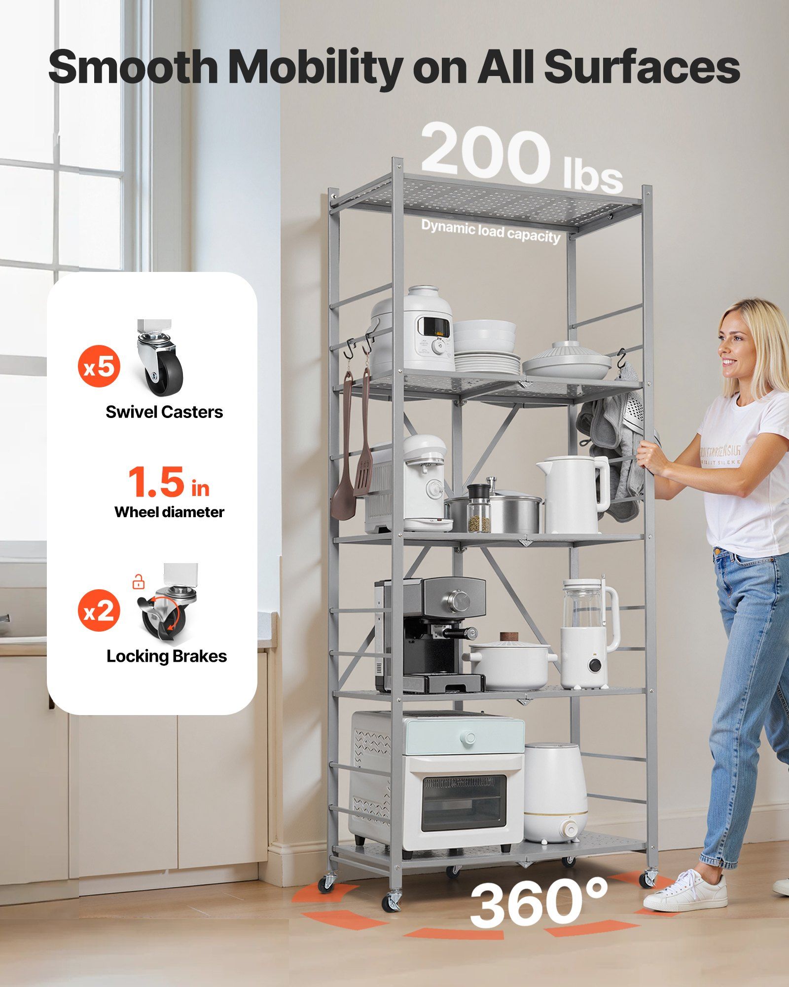 2.Easy Mobility: With 5 swivel wheels (2 with brakes), this folding shelf moves effortlessly on tiles, cement, and epoxy floors. The 360° rotation solves the old 'stuck shelf' problem, supporting up to 200 lbs.