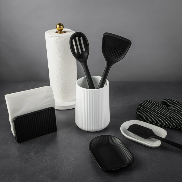 Organize your kitchen in style with the Thyme and Table Ceramic White Ribbed Kitchen Utensil Holder. It features a modern ribbed design and durable ceramic construction. This holder adds a sleek, sophisticated touch to your countertop. It's designed to keep cooking utensils neatly within reach. A practical and stylish addition to any kitchen. Ideal for home cooks who value organization and elegance.