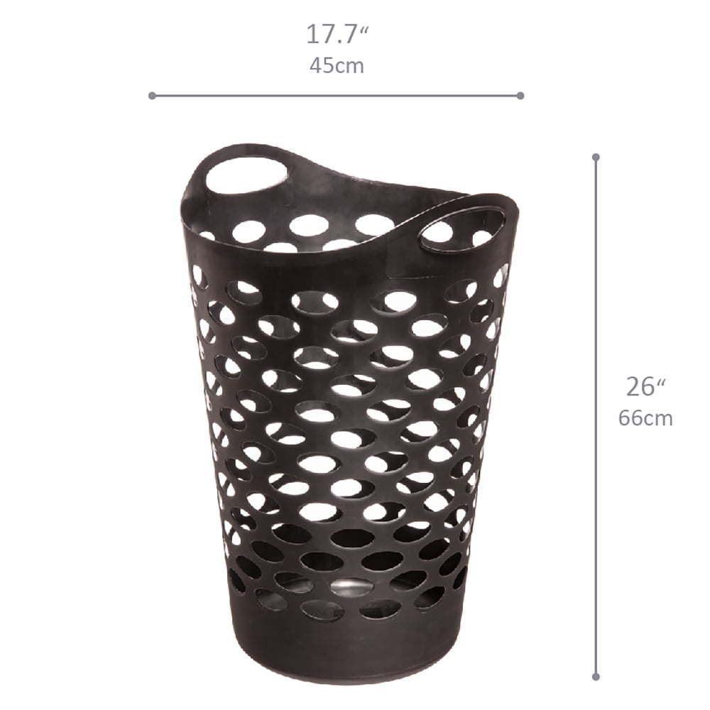The Flexible Plastic Round Laundry Hamper in black is a practical solution for everyday laundry needs. Made from lightweight yet durable polyethylene, this hamper is designed with two sturdy carrying handles for easy transport. Its flexible construction and round shape make it ideal for maximizing space in laundry rooms, bedrooms, or closets. The hamper holds up to 2.2 bushels of laundry and includes ventilation holes to help reduce moisture and inhibit mold growth. With a sleek black finish, it blends seamlessly into any home décor while keeping dirty clothes organized and off the floor.