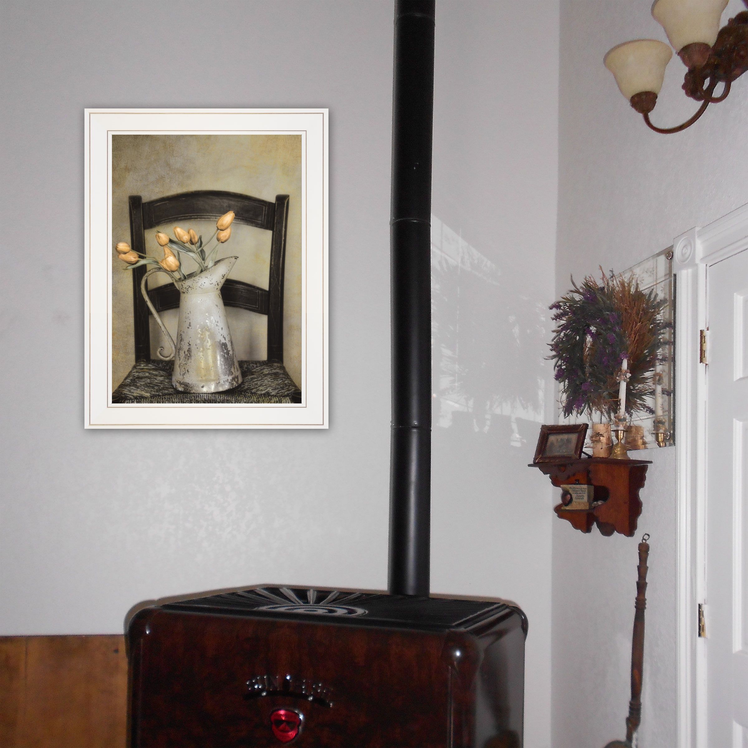 "Golden Tulips" by Robin-Lee Vieira. This decorative white framed print 15"x19" of tulips setting in a tin pitcher on an old black cane chair. Framed print has a UV coating (glass is not needed) and arrives ready to hang.•TEXTURED ARTWORK with a 'rolled on' acid-free acrylic coating to create a canvas painting effect.•UV PROTECTANT COATING protects artwork from fading. No glass is necessary.• MOULDING adds natural beauty to the framed art. Frame is keyholed for the easy hanging.•THIS FINE HOME DECOR piece made in the USA by Woman Owned Business (WBE) is a perfect gift for a friend or relative.